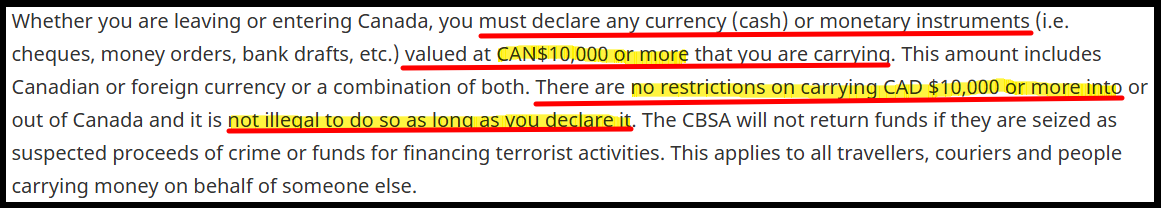 👉 캐나다는 현금 소지 ‘제한’이 아니라 ‘신고 기준’이 있습니다.